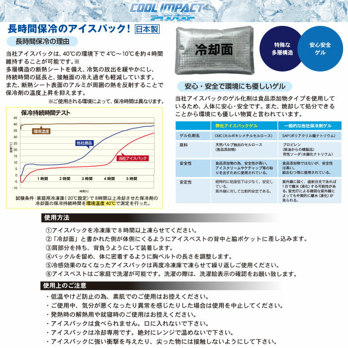 <おすすめのご利用シーン>工事現場、建設現場、倉庫内軽作業、清掃業、アウトドア・レジャー、屋外イベント、冷房の使えない場所ならどこでも!食中毒対策にお弁当などの保冷剤としてアイスパックのみのご使用も可能です。